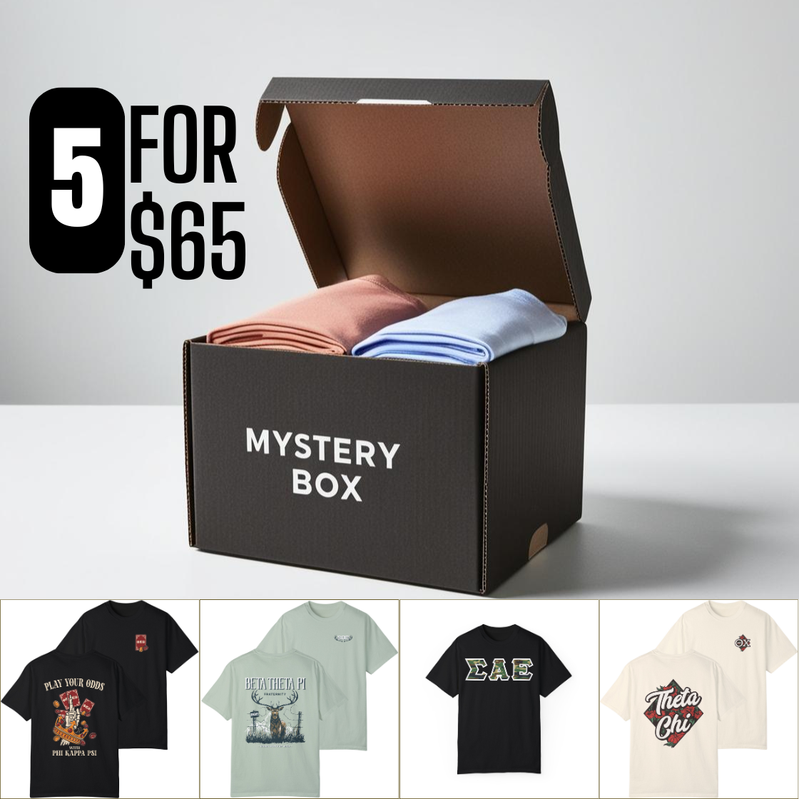 Level up your fraternity gear with our exclusive Mystery Box—featuring 5 premium shirts hand-selected by our team.