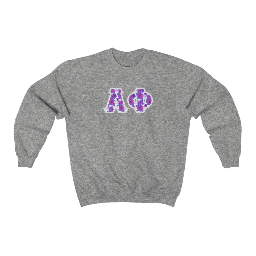 These Alpha Phi sorority letters are printed NOT stitched. They come in a number of color and garment options.
