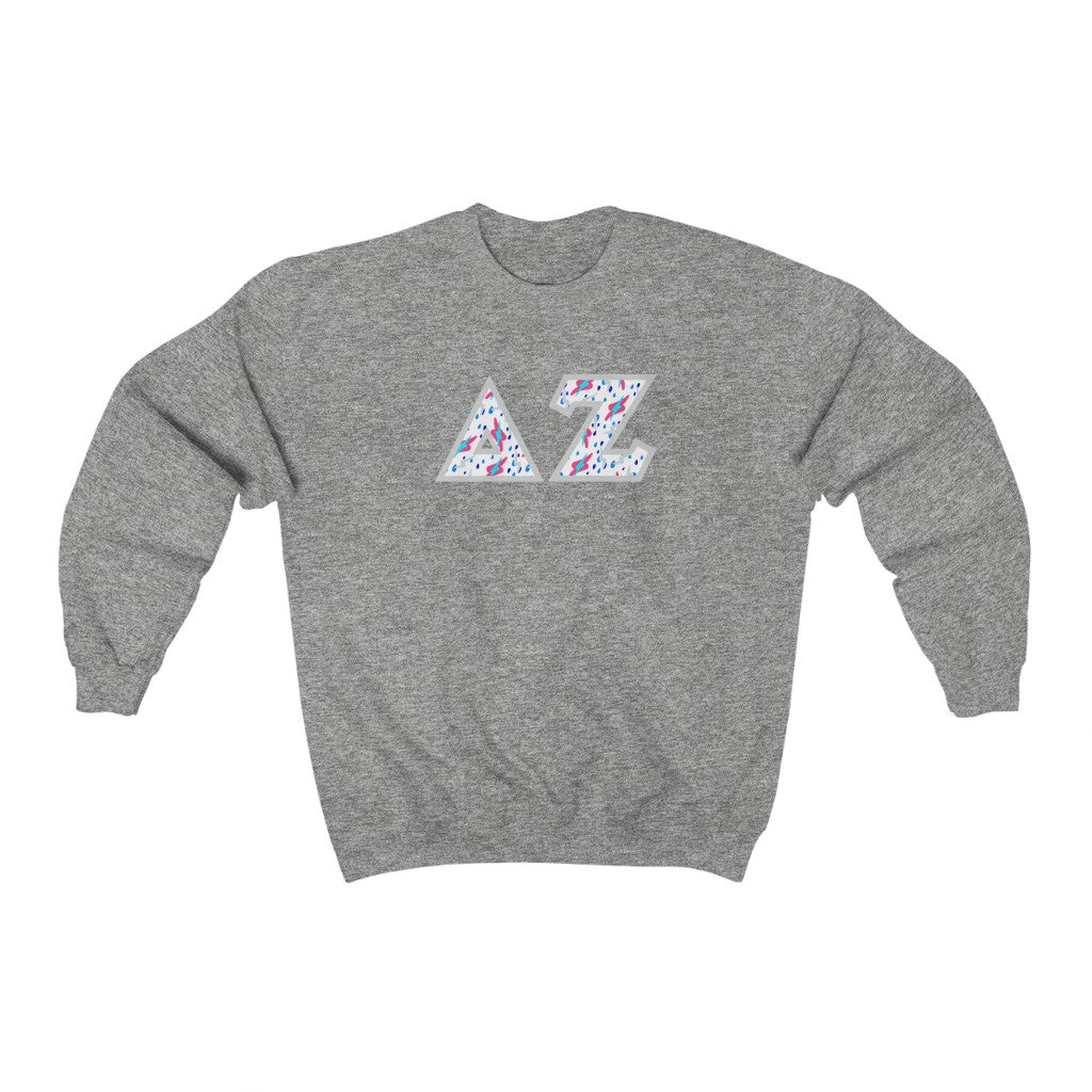 These Delta Zeta sorority letters are printed NOT stitched. They come in a number of color and garment options.