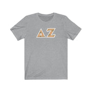 These Delta Zeta sorority letters are printed NOT stitched. They come in a number of color and garment options.