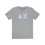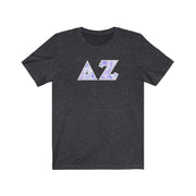 These Delta Zeta sorority letters are printed NOT stitched. They come in a number of color and garment options.