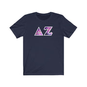 These Delta Zeta sorority letters are printed NOT stitched. They come in a number of color and garment options.