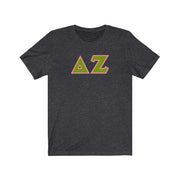 These Delta Zeta sorority letters are printed NOT stitched. They come in a number of color and garment options.