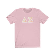 These Delta Zeta sorority letters are printed NOT stitched. They come in a number of color and garment options.