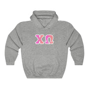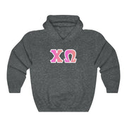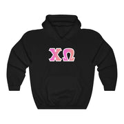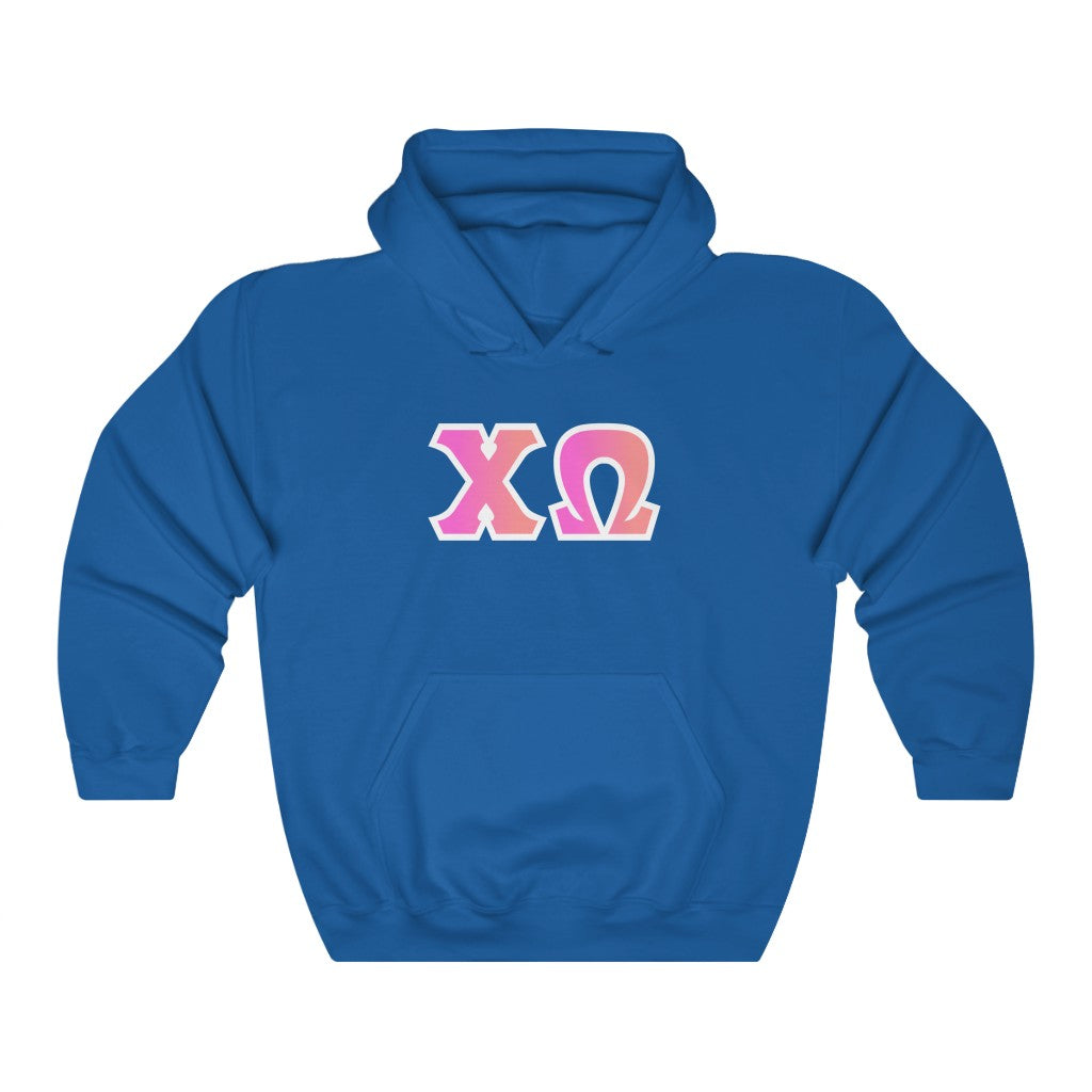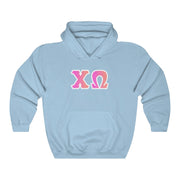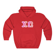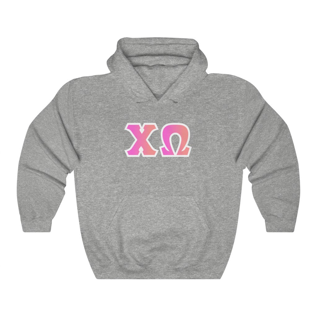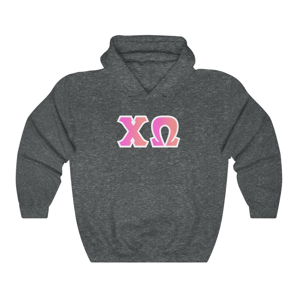 These Chi Omega sorority letters are printed NOT stitched. They come in a number of color and garment options.