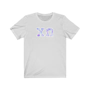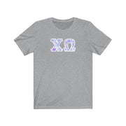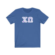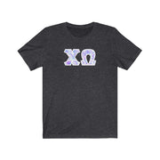 These Chi Omega sorority letters are printed NOT stitched. They come in a number of color and garment options.