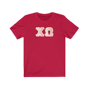 These Chi Omega sorority letters are printed NOT stitched. They come in a number of color and garment options.