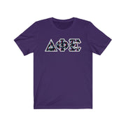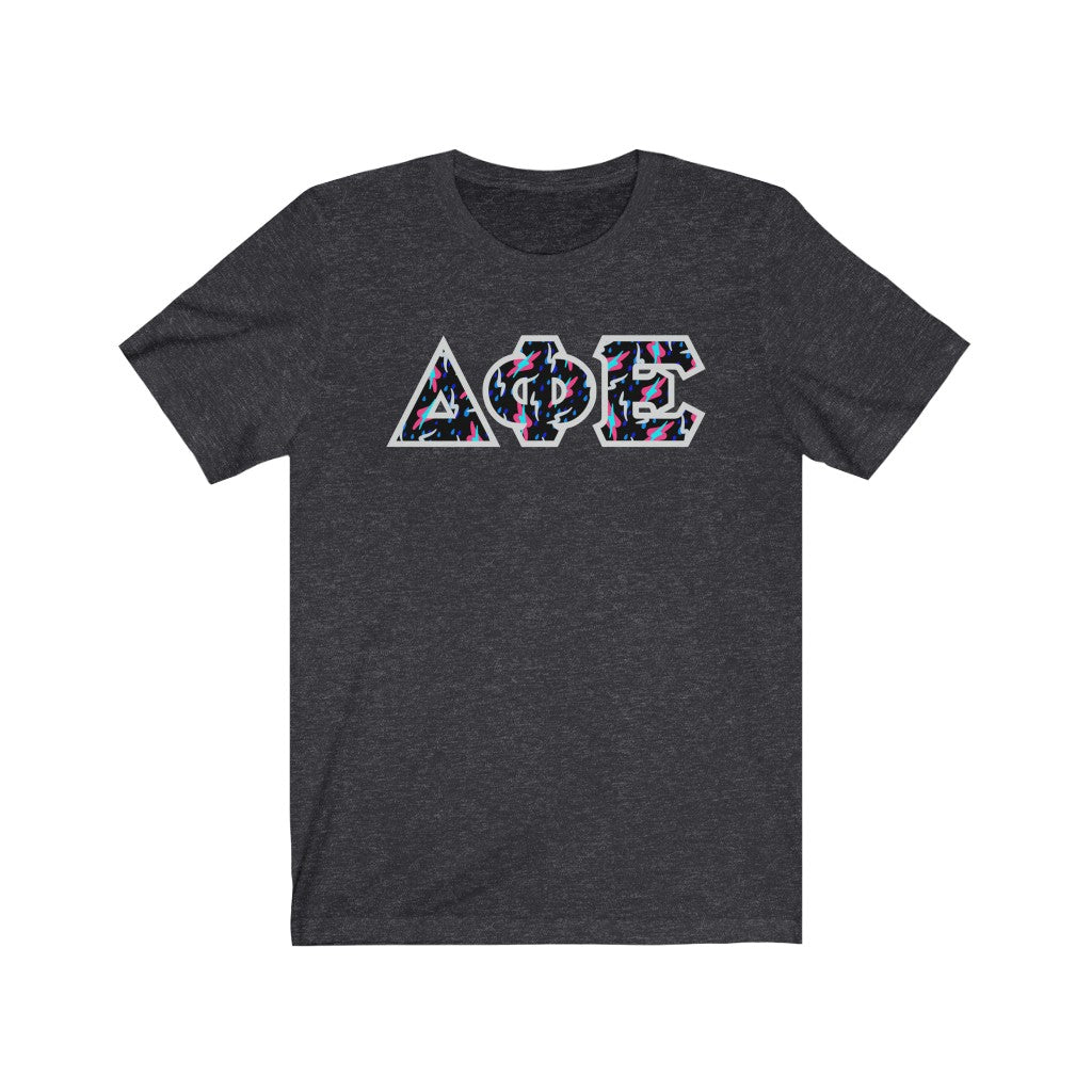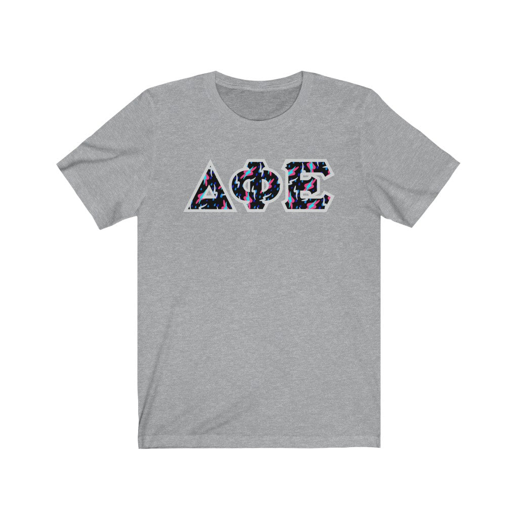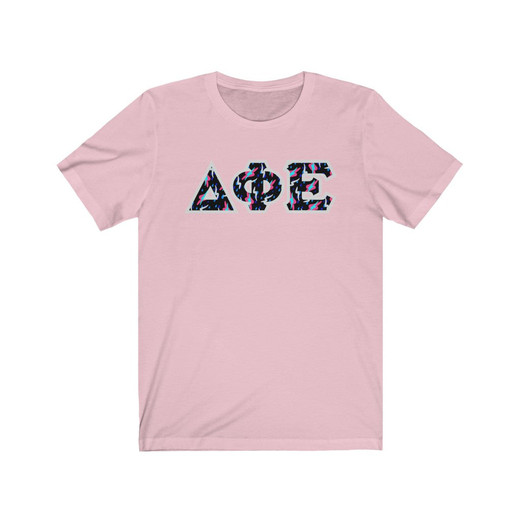These Delta Phi Epsilon sorority letters are printed NOT stitched. They come in a number of color and garment options.