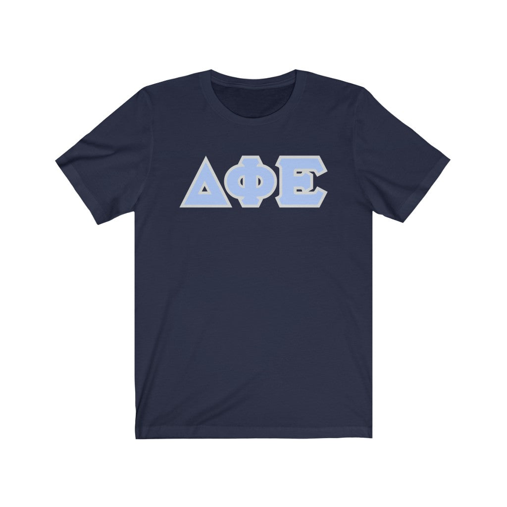 These Delta Phi Epsilon sorority letters are printed NOT stitched. They come in a number of color and garment options.
