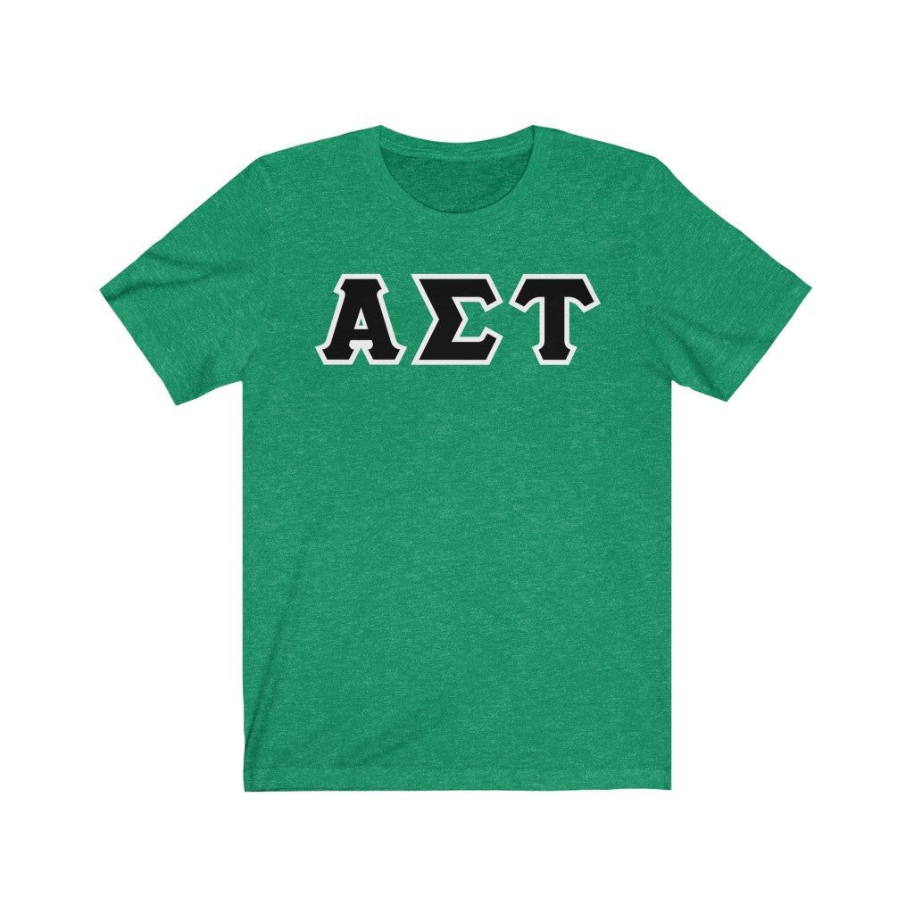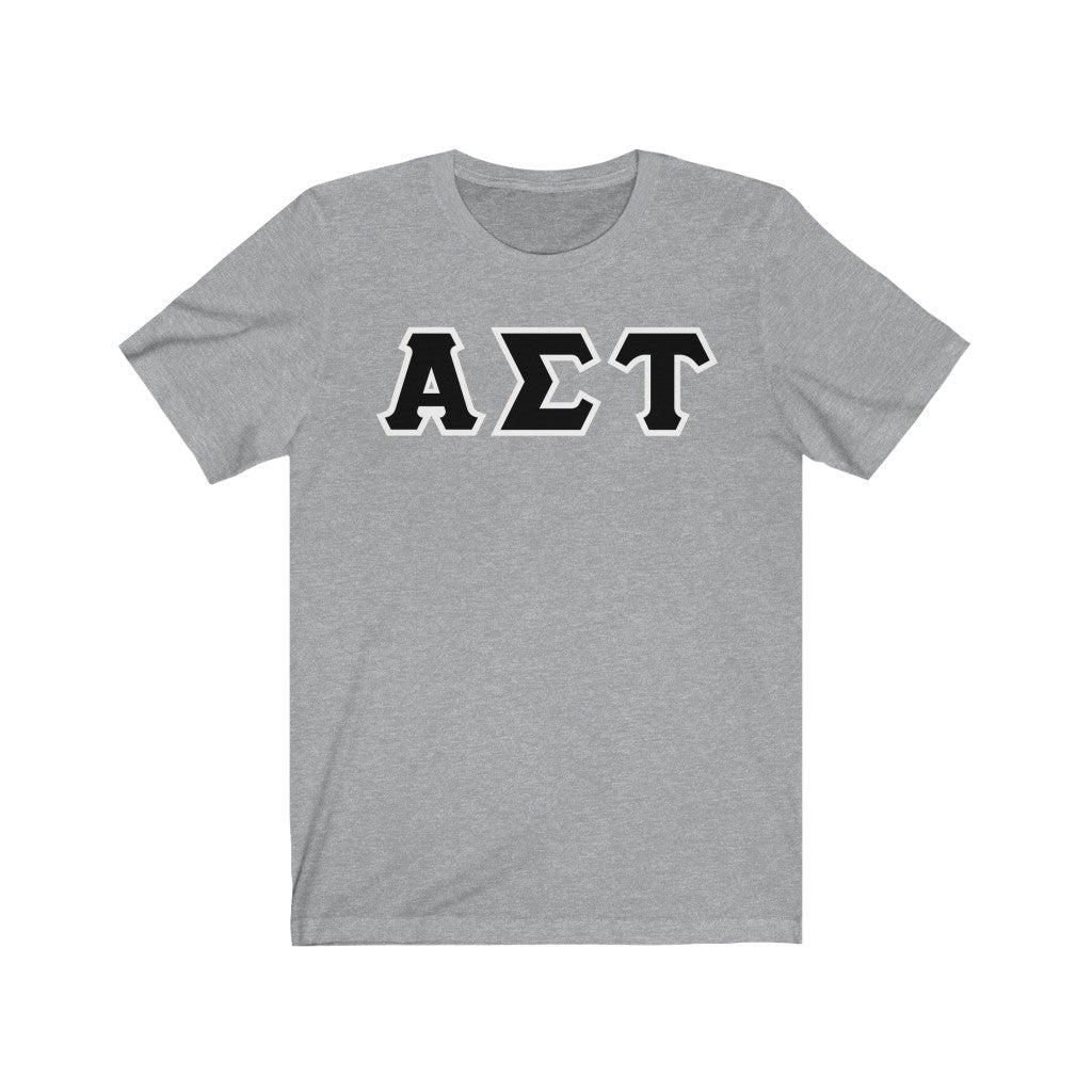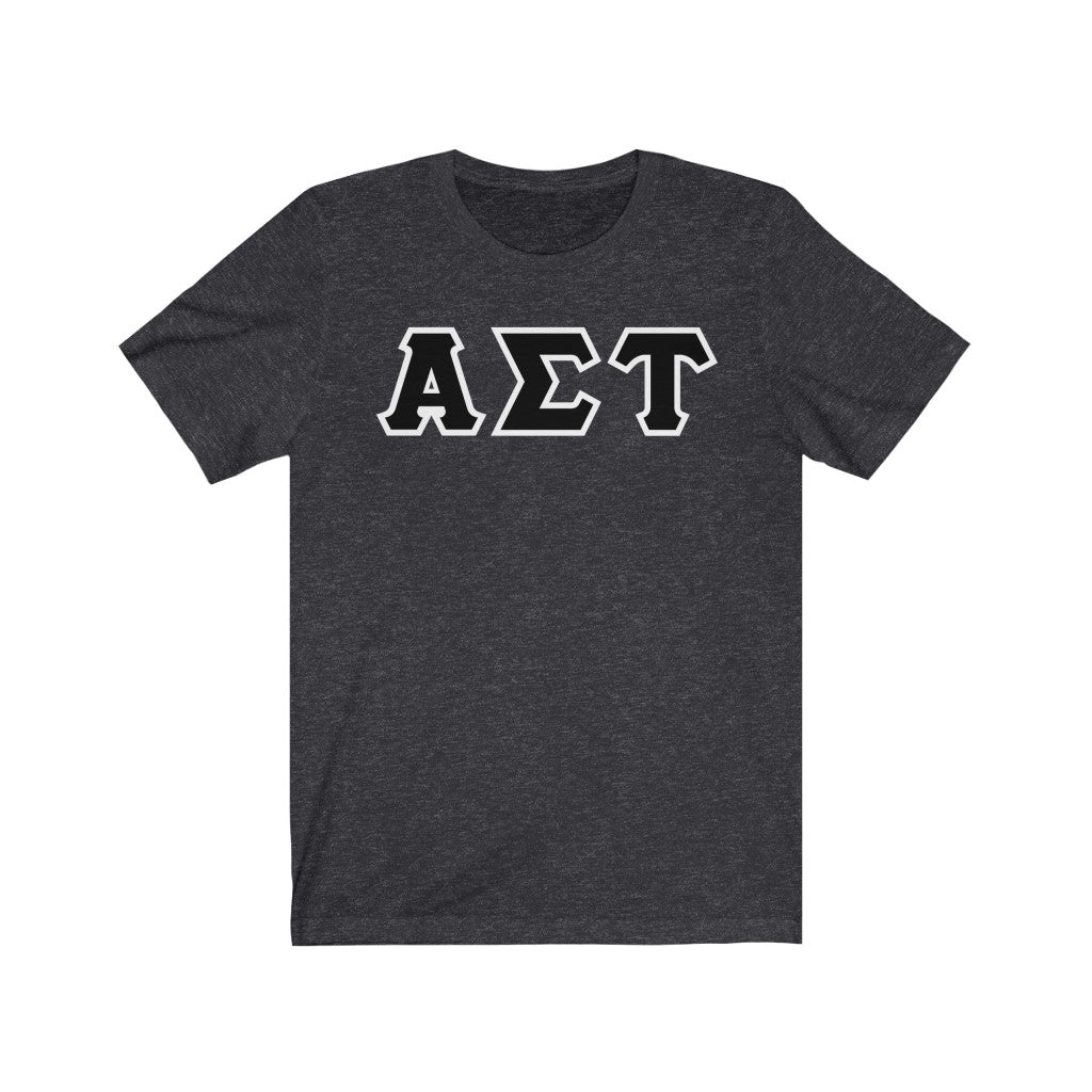 These Alpha Sigma Tau sorority letters are printed NOT stitched. They come in a number of color and garment options.