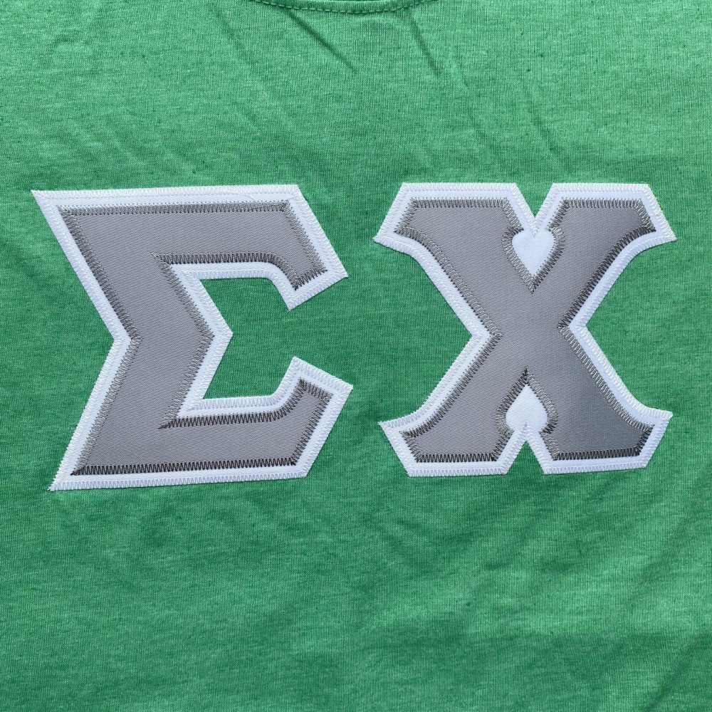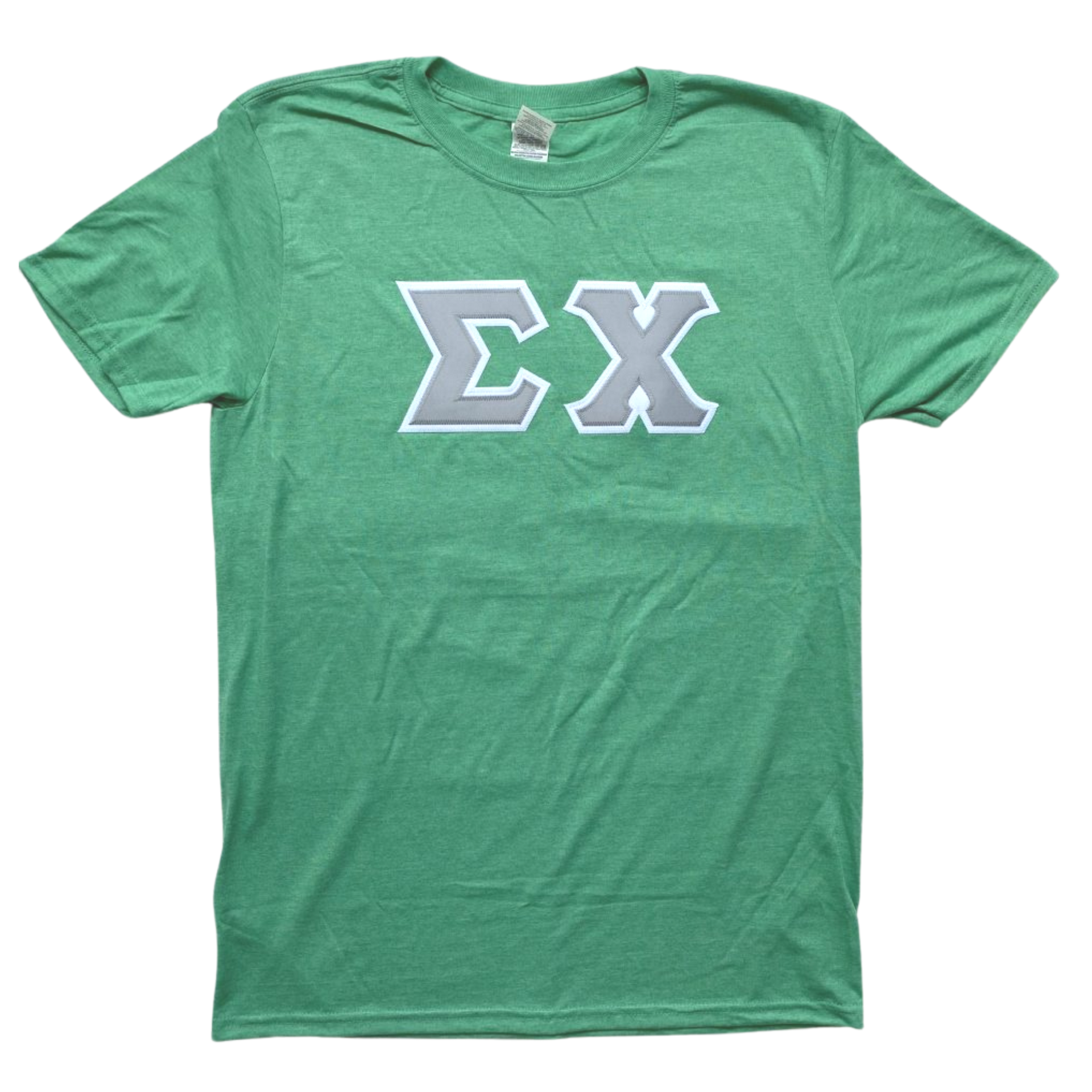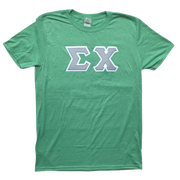 Sigma Chi Stitched Letter T-Shirt | Heather Irish Green | Gray with White Border