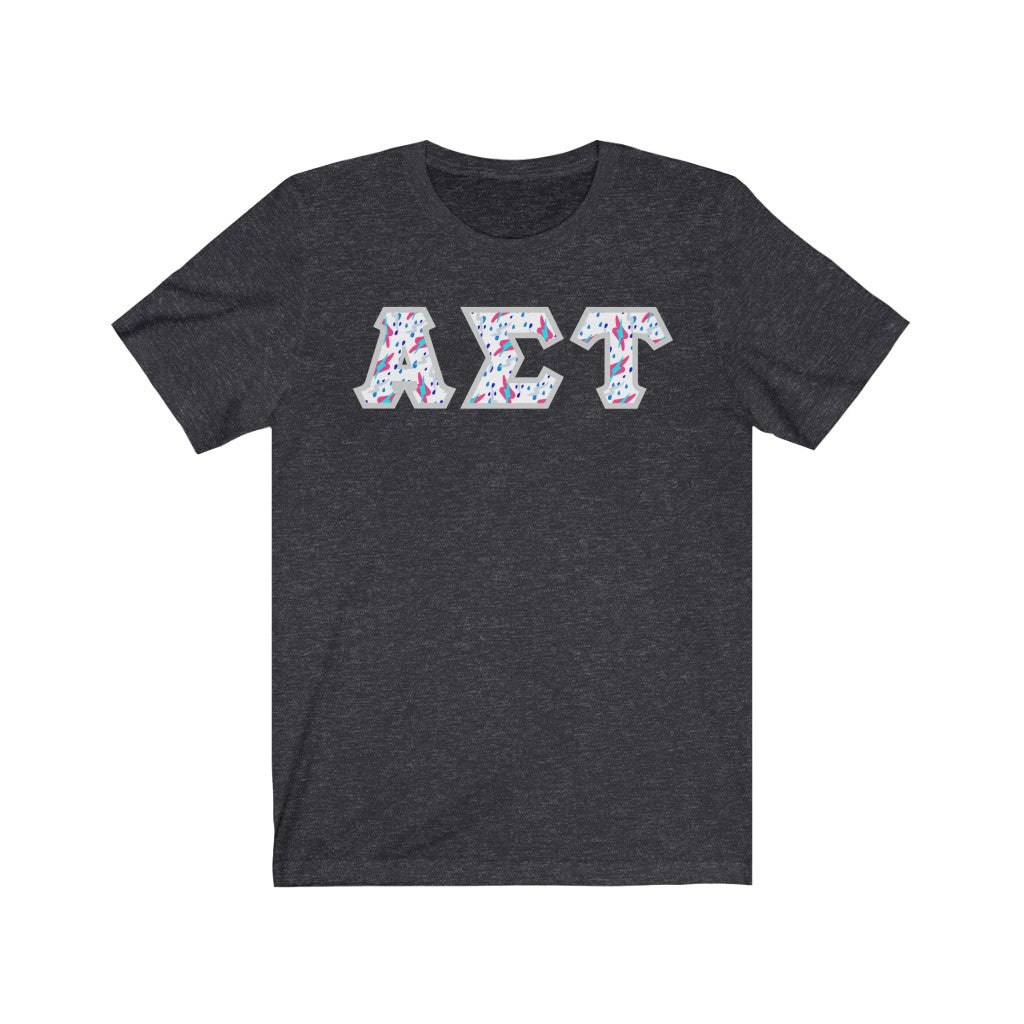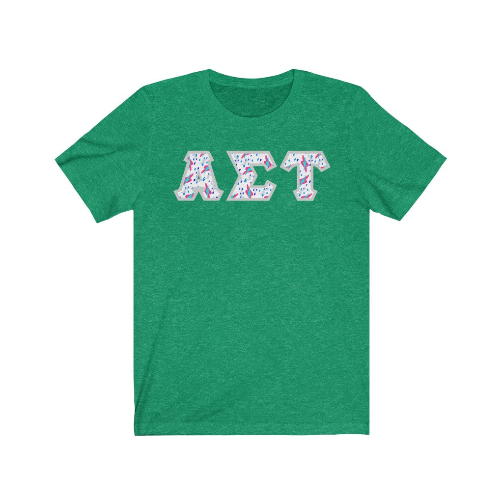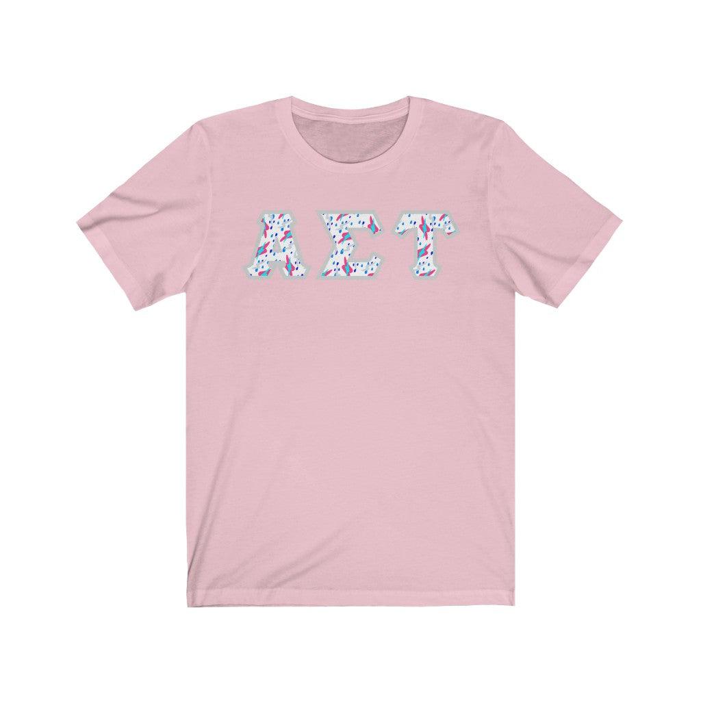 These Alpha Sigma Tau sorority letters are printed NOT stitched. They come in a number of color and garment options.
