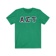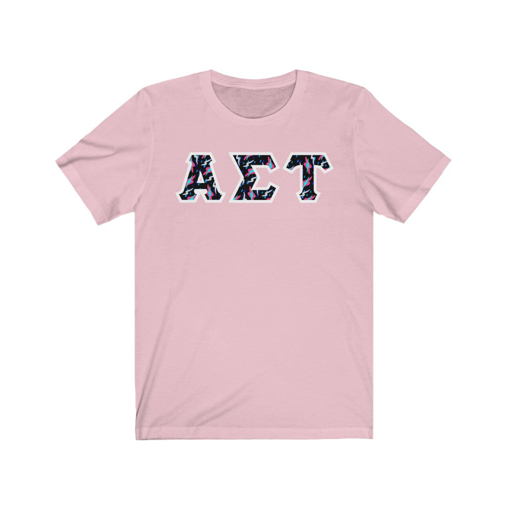 These Alpha Sigma Tau sorority letters are printed NOT stitched. They come in a number of color and garment options.