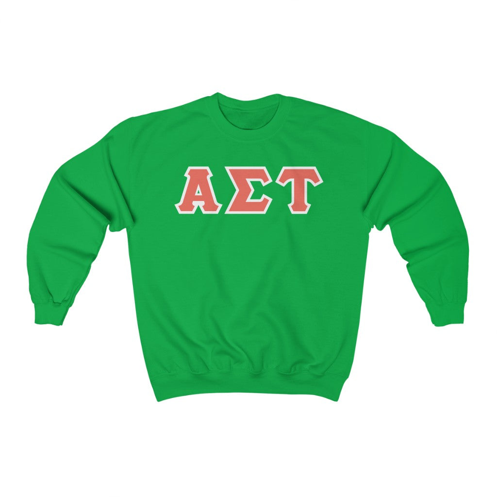 These Alpha Sigma Tau sorority letters are printed NOT stitched. They come in a number of color and garment options.