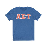 These Alpha Sigma Tau sorority letters are printed NOT stitched. They come in a number of color and garment options.