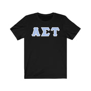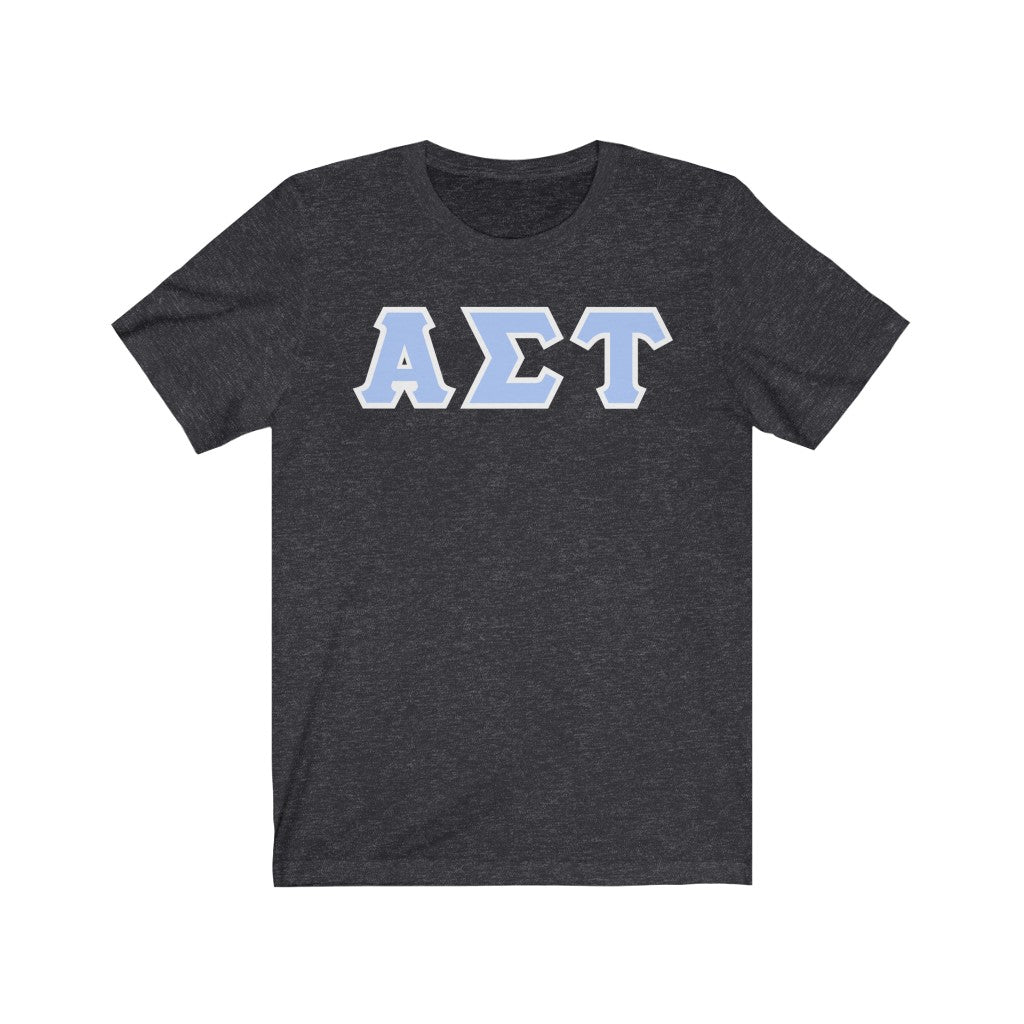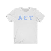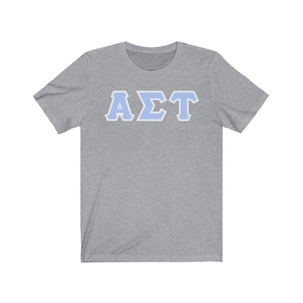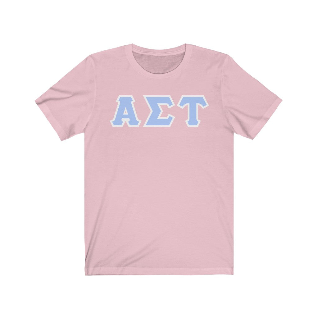These Alpha Sigma Tau sorority letters are printed NOT stitched. They come in a number of color and garment options.