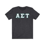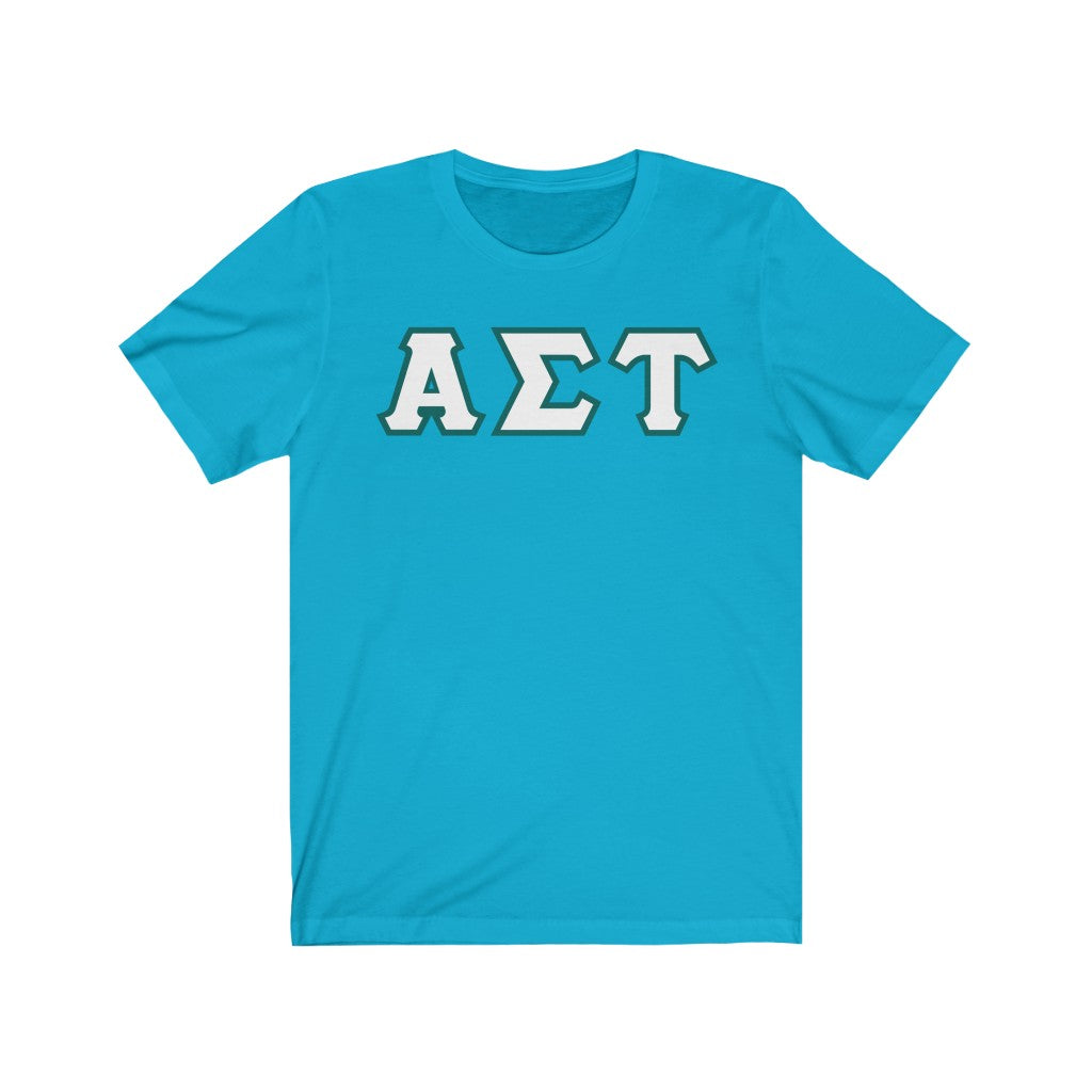 These Alpha Sigma Tau sorority letters are printed NOT stitched. They come in a number of color and garment options.