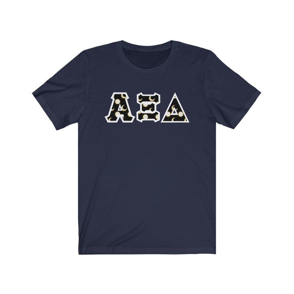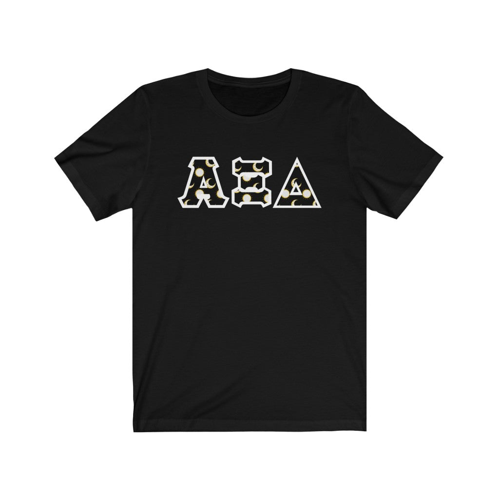 These Alpha Xi Delta sorority letters are printed NOT stitched. They come in a number of color and garment options.
