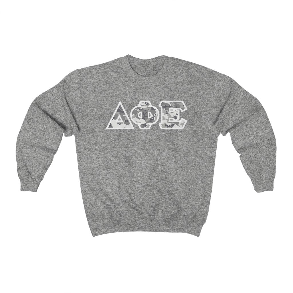 Delta Phi Epsilon Printed Letters | Winter Camo Crewneck