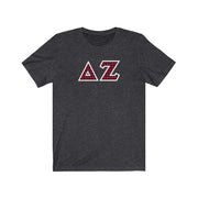 These Delta Zeta sorority letters are printed NOT stitched. They come in a number of color and garment options.