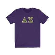 These Delta Zeta sorority letters are printed NOT stitched. They come in a number of color and garment options.