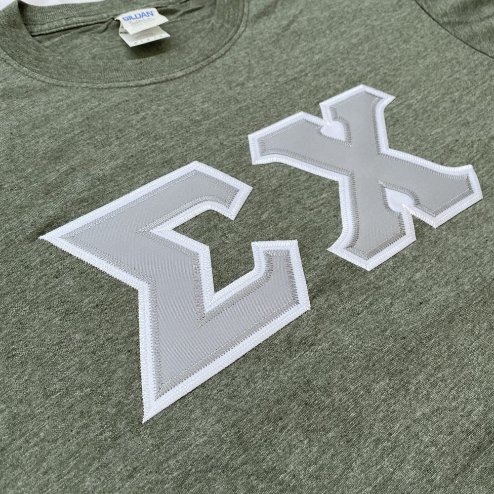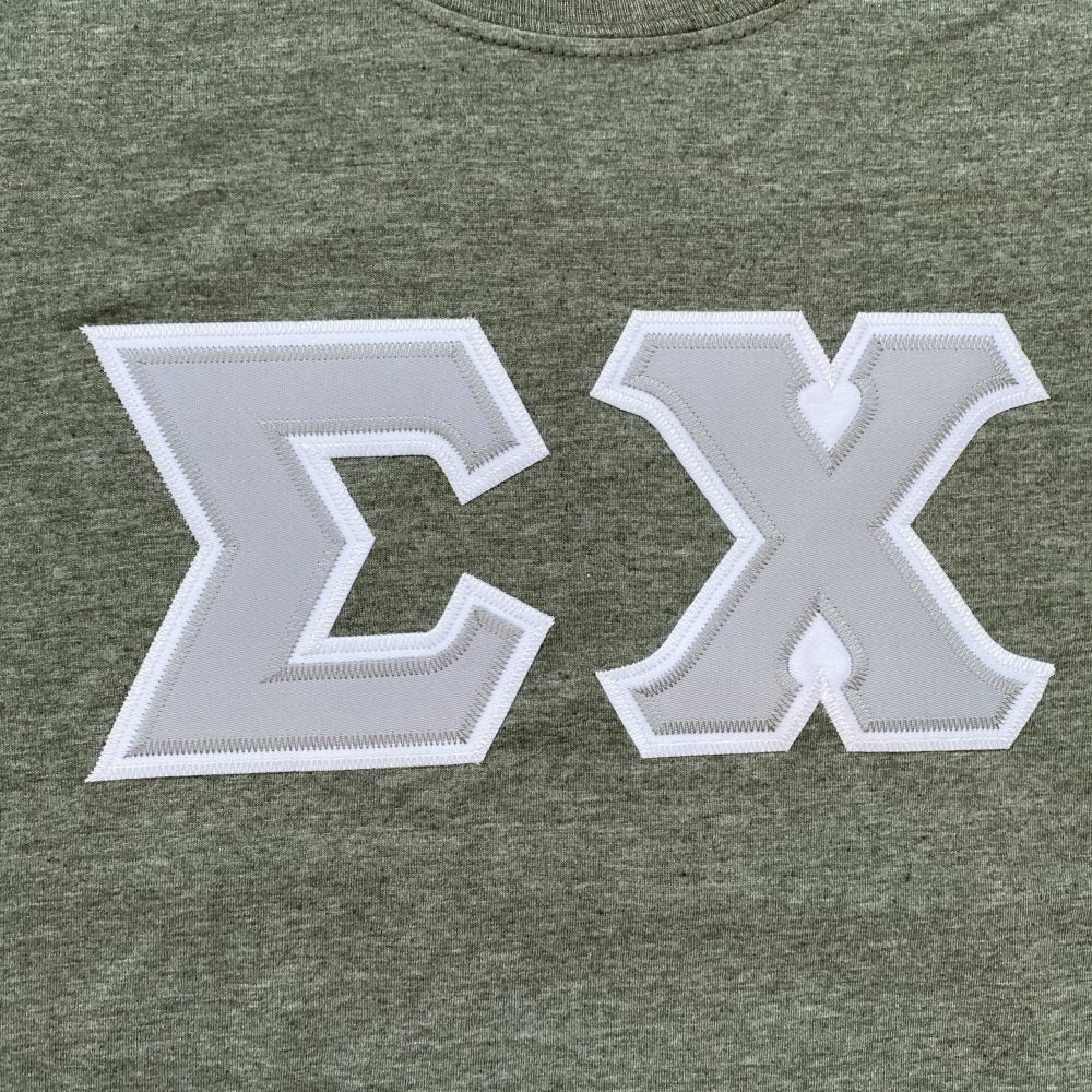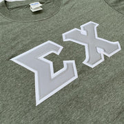 Sigma Chi Stitched Letter T-Shirt | Heather Military Green | Gray with White Border