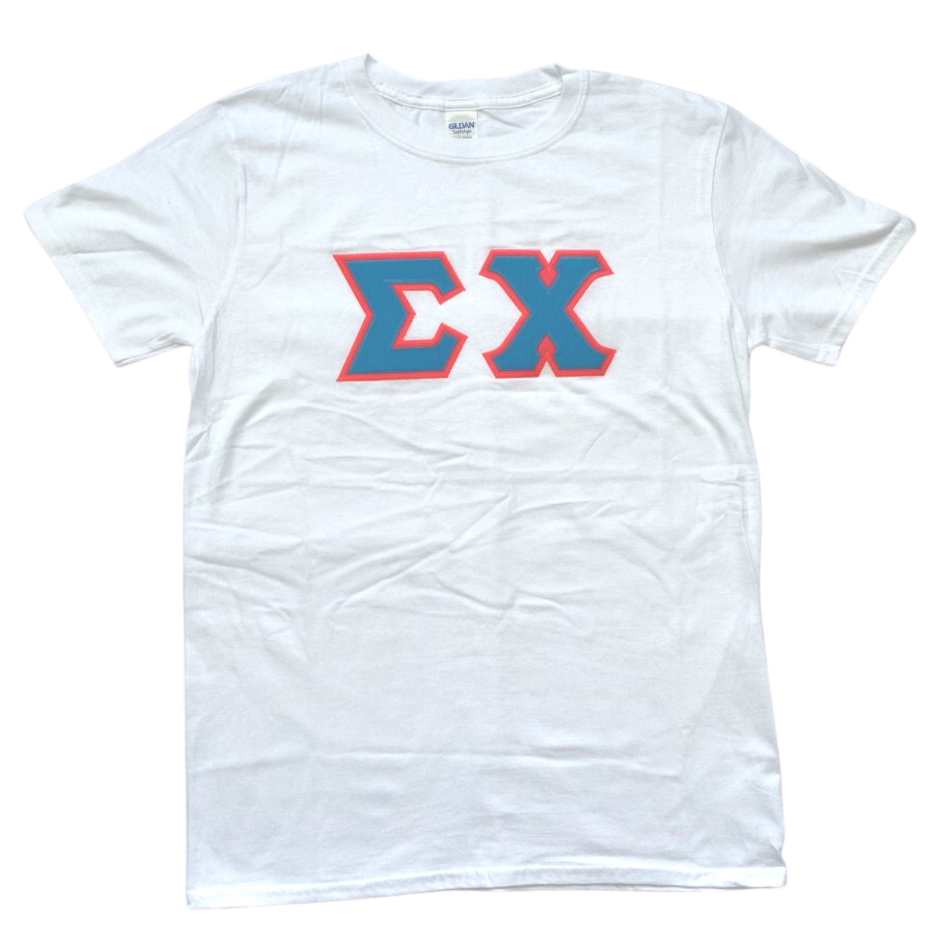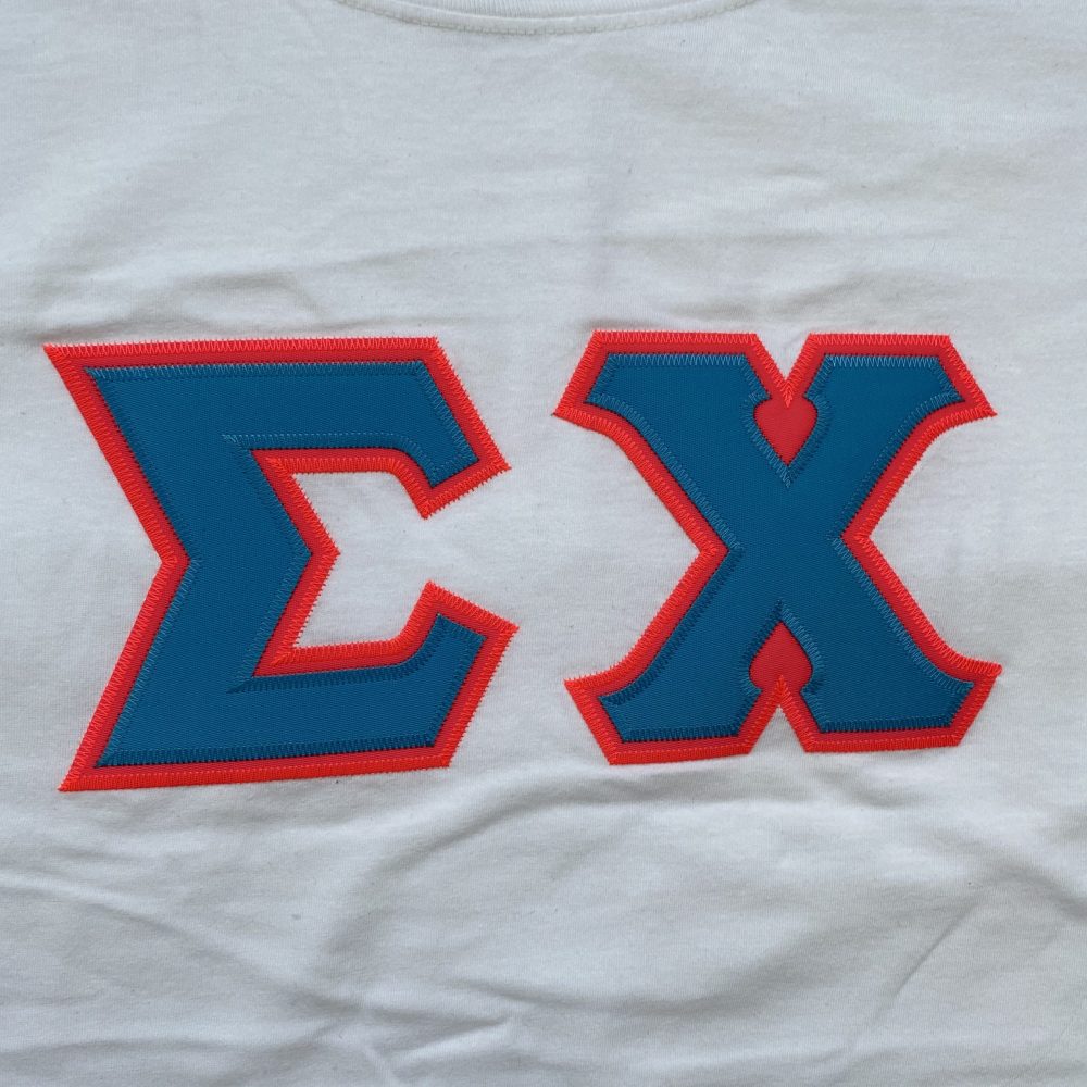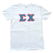 Sigma Chi Stitched Letter T-Shirt | White | Cyan with Pink Border